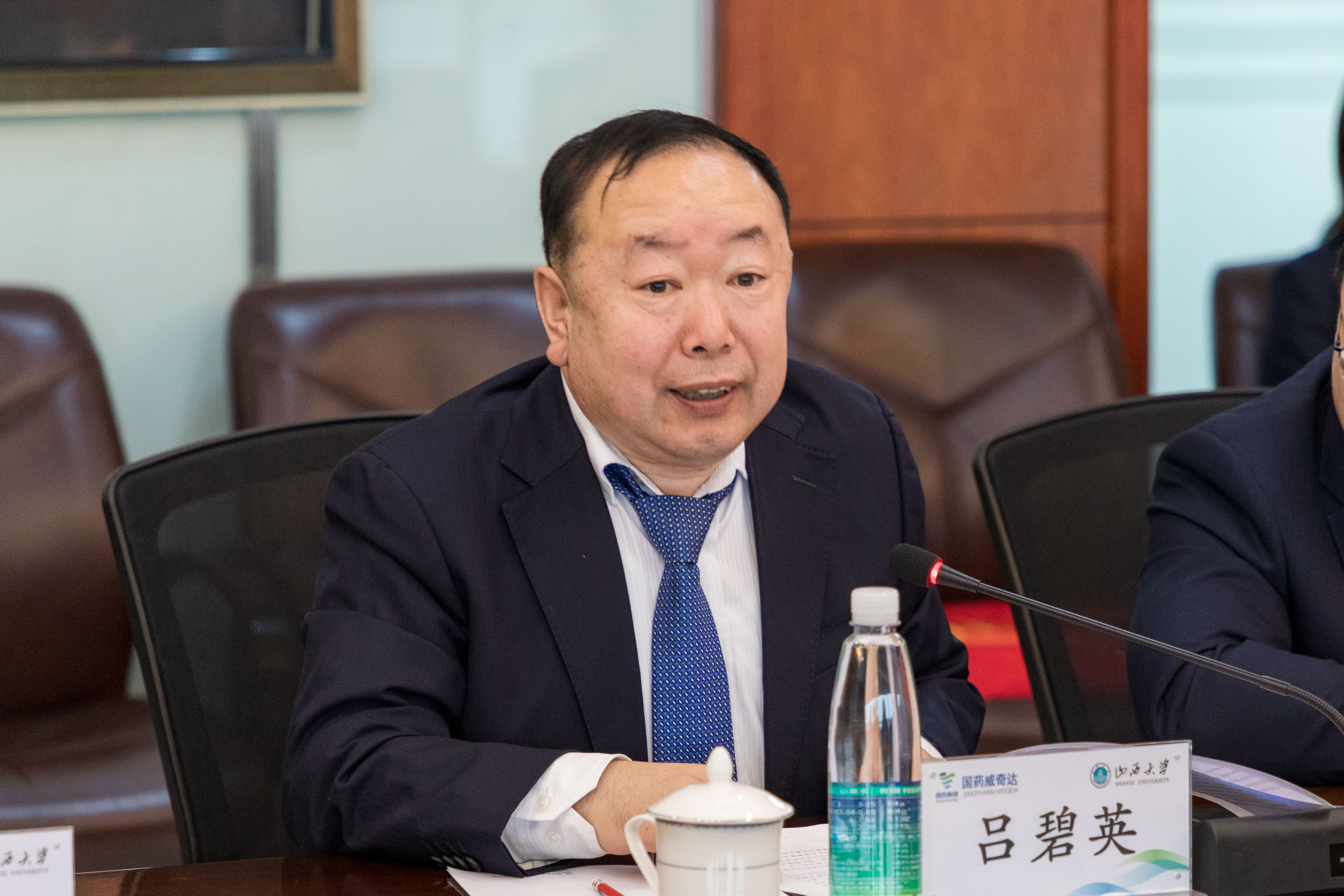 吕碧英代表公司致辞。他指出,推进校企战略合作,是深入贯彻落实习近平总书记重要讲话和重要指示批示精神的重要举措,对于推进产学研深度融合、把握产业发展新机遇、加快高质量应用型人才培养具有重要意义。长期以来,国药威奇达与山西大学在科研平台建设、科研人才培养、毕业生就业等方面进行了卓有成效的合作。此次战略合作框架协议的签署,标志着双方合作的进一步深化。必将会更好地实现资源共享、优势互补、合作共赢,为医药健康产业培养出更多更好的优秀人才,为加快推进健康中国建设作出新的更大的贡献。