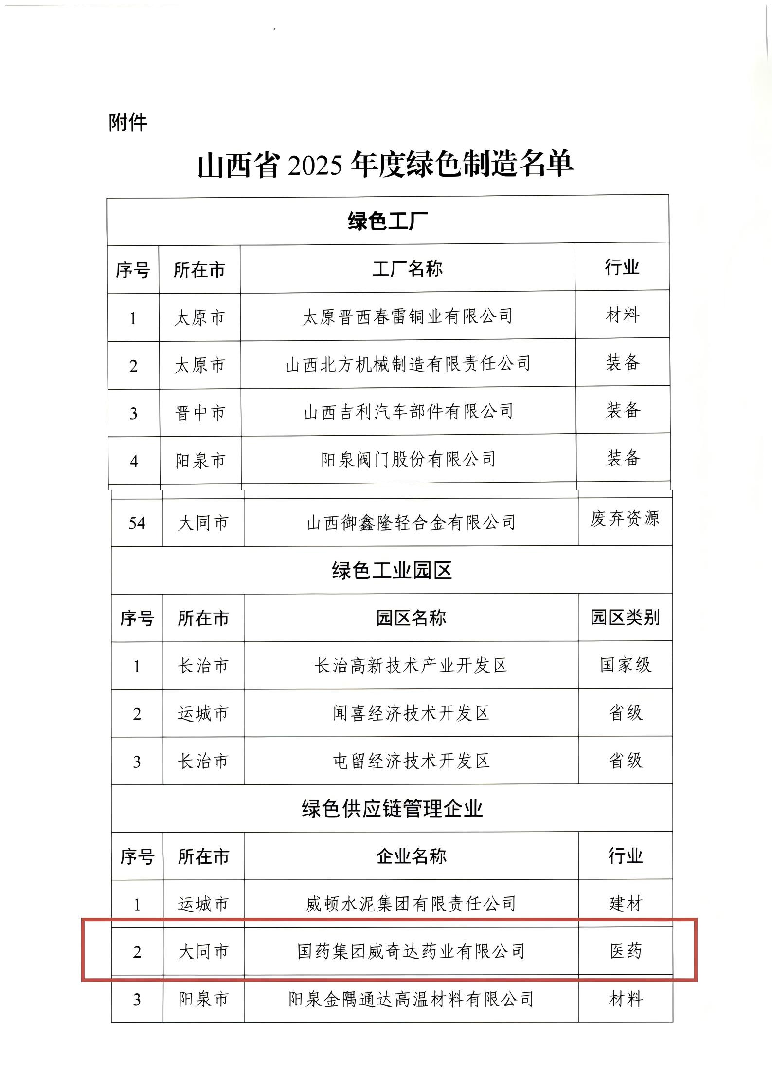 近日,山西省工业和信息化厅公布山西省2025年度绿色制造名单,国药威奇达成功上榜,成为山西省“绿色供应链管理企业”。