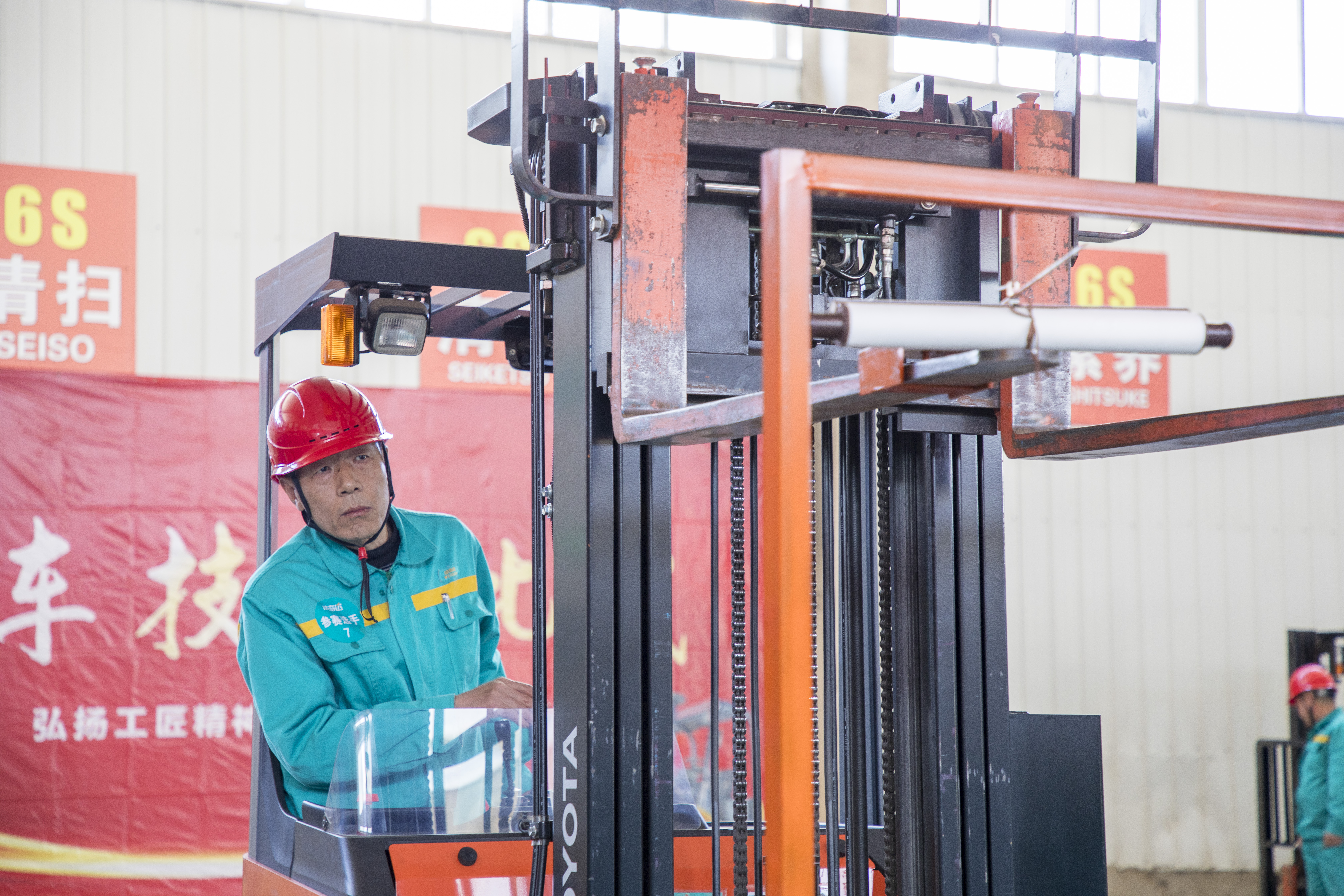 供应链中心叉车技能比武大赛现场,选手们娴熟操作平衡重式叉车与前移式叉车,时而化身灵巧的“钢铁舞者”,托举长管在蜿蜒桩阵中闪转腾挪,并将其精准悬挂于吊环之上,时而灵巧开卷,展开由员工创作的庆祝中华全国总工会成立100周年的书法卷轴。轻盈的海洋球被钢铁巨手轻轻捧起,取物、旋转、投掷一气呵成,易碎的红酒杯被层层叠放成晶莹塔楼,斟“酒”而不倾,以精度和速度诠释了“刚柔并济”的技能美学。