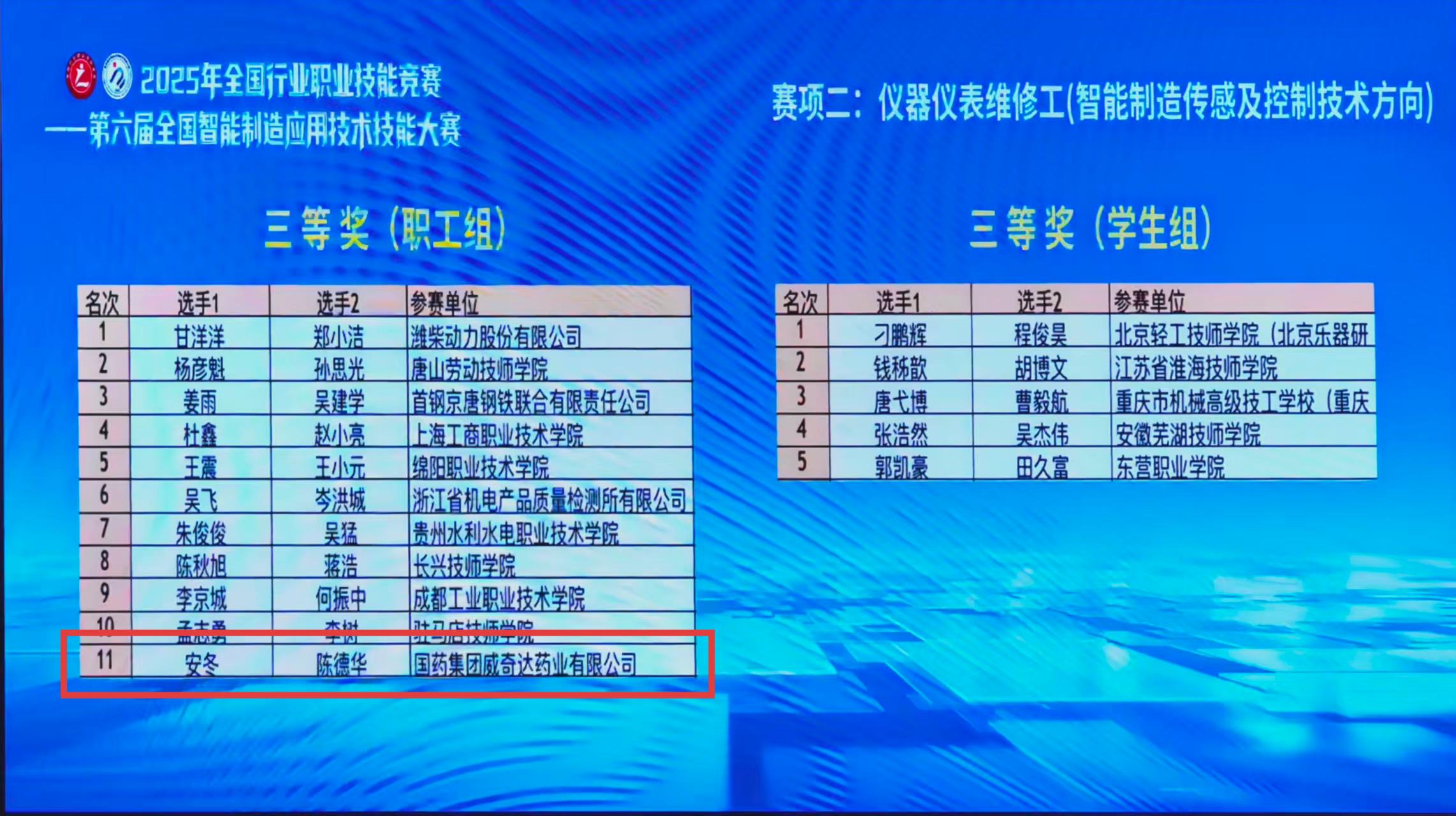 近日,2025年全国行业职业技能竞赛——第六届全国智能制造应用技术技能大赛决赛重庆赛区比赛圆满落幕。经过三天的激烈角逐,代表山西省出战的国药威奇达选手安冬、陈德华凭借扎实的专业功底和默契的团队协作,获得仪器仪表维修工(智能制造传感及控制技术方向)赛项三等奖,充分彰显了公司深耕技能人才培养,赋能高质量发展的显著成效。