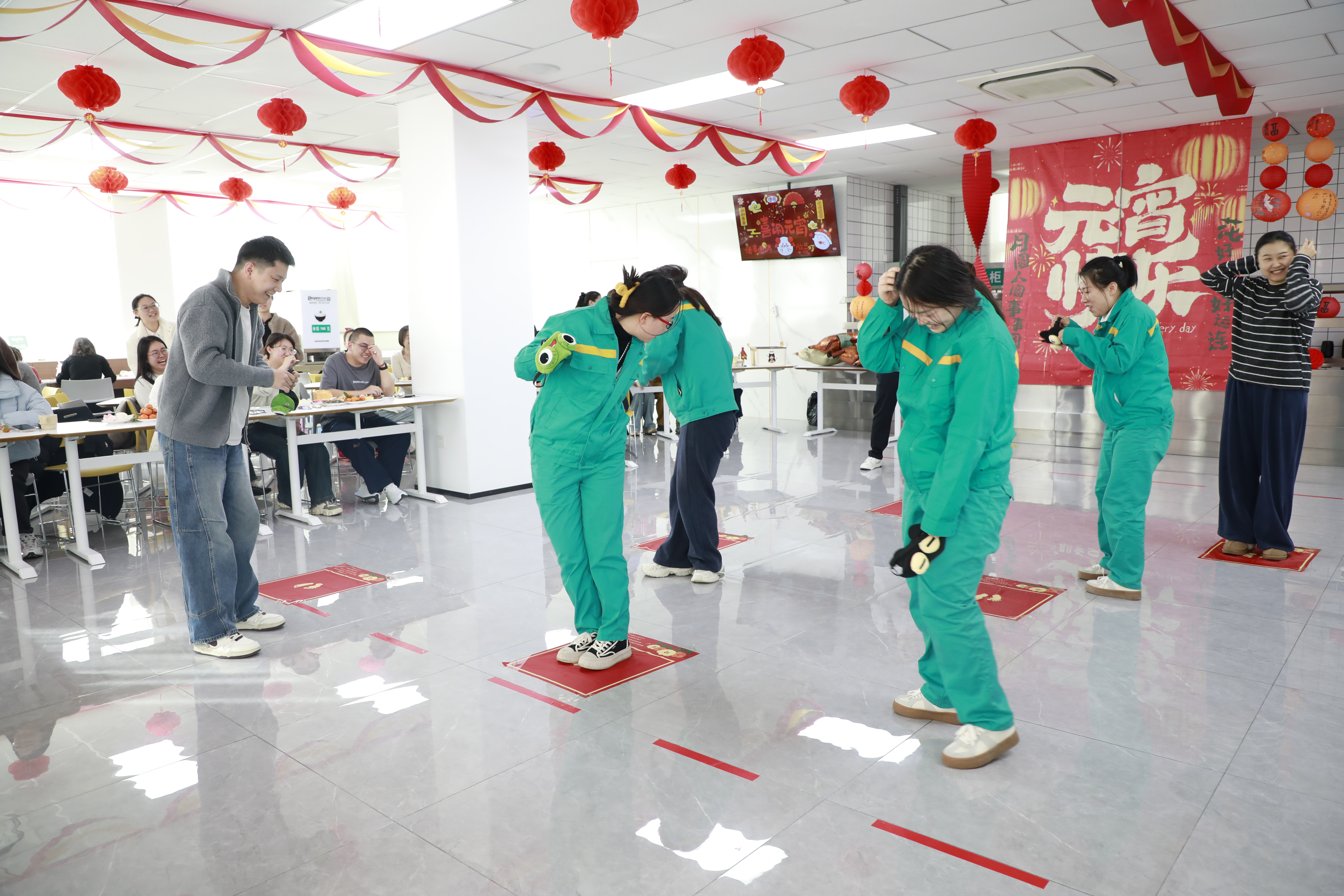 在研究中心会场,“元宵快乐”绘布高高挂起,灯笼彩带悬挂屋顶,营造出浓浓的节日氛围。活动一开场,“巧手制花灯”环节就率先点燃热情!大家围坐在一起,穿线、粘贴、装饰,指尖翻飞间,一盏盏造型各异的花灯逐渐成型。游戏环节更是活力满满,“策马扬鞭闹元宵”“喜乐团圆踏福来”“团团圆圆大搬运”“一击即中沾福气”四个游戏依次进行,灯谜竞猜穿插其间,现场加油声、欢笑声此起彼伏,每一轮比拼都充满惊喜,每一份参与都承载欢乐。活动尾声,大家共同展示亲手制作的花灯、共享暖心元宵,将团圆与祝福融入舌尖,收获满满的喜悦与福气。