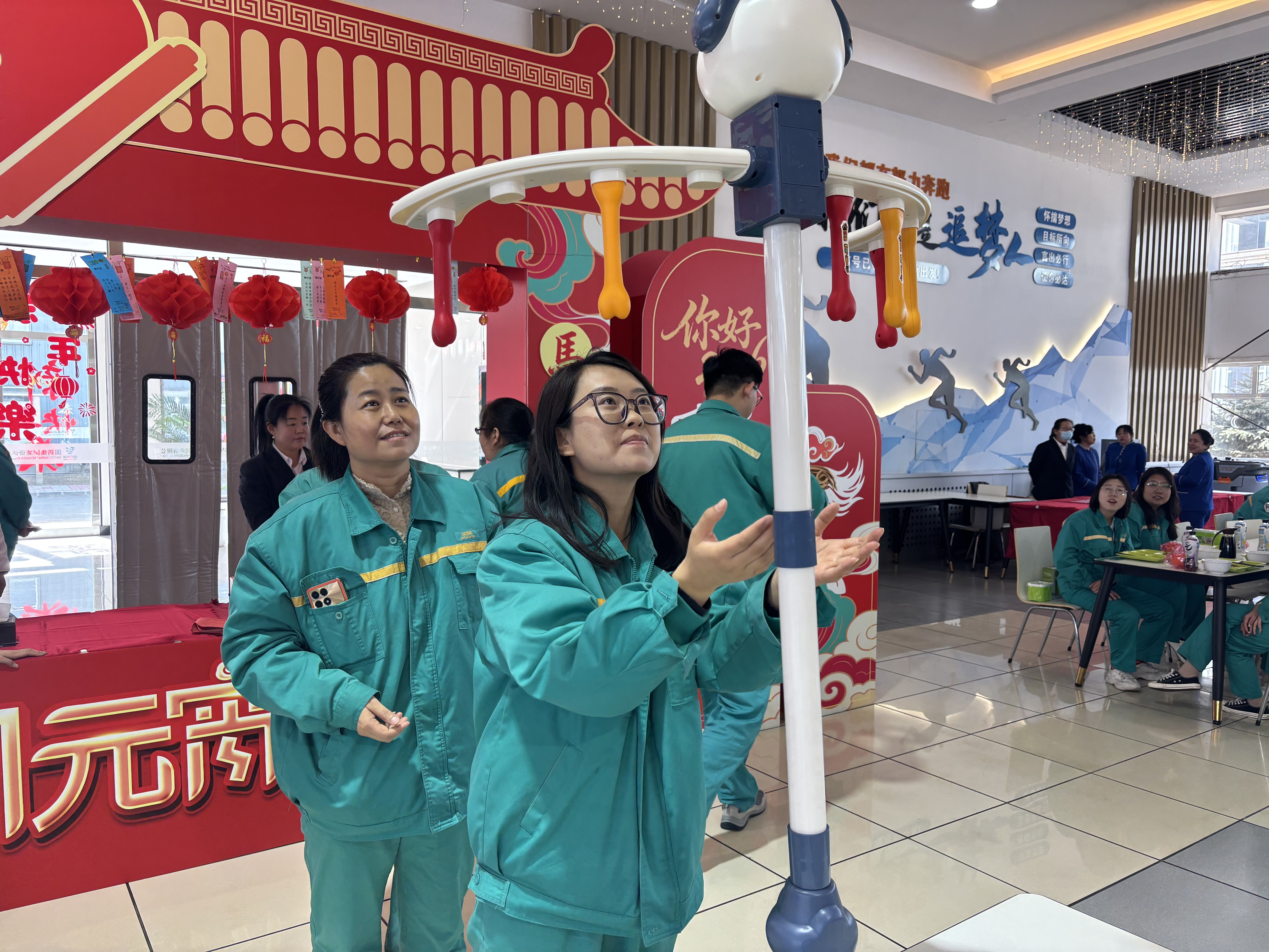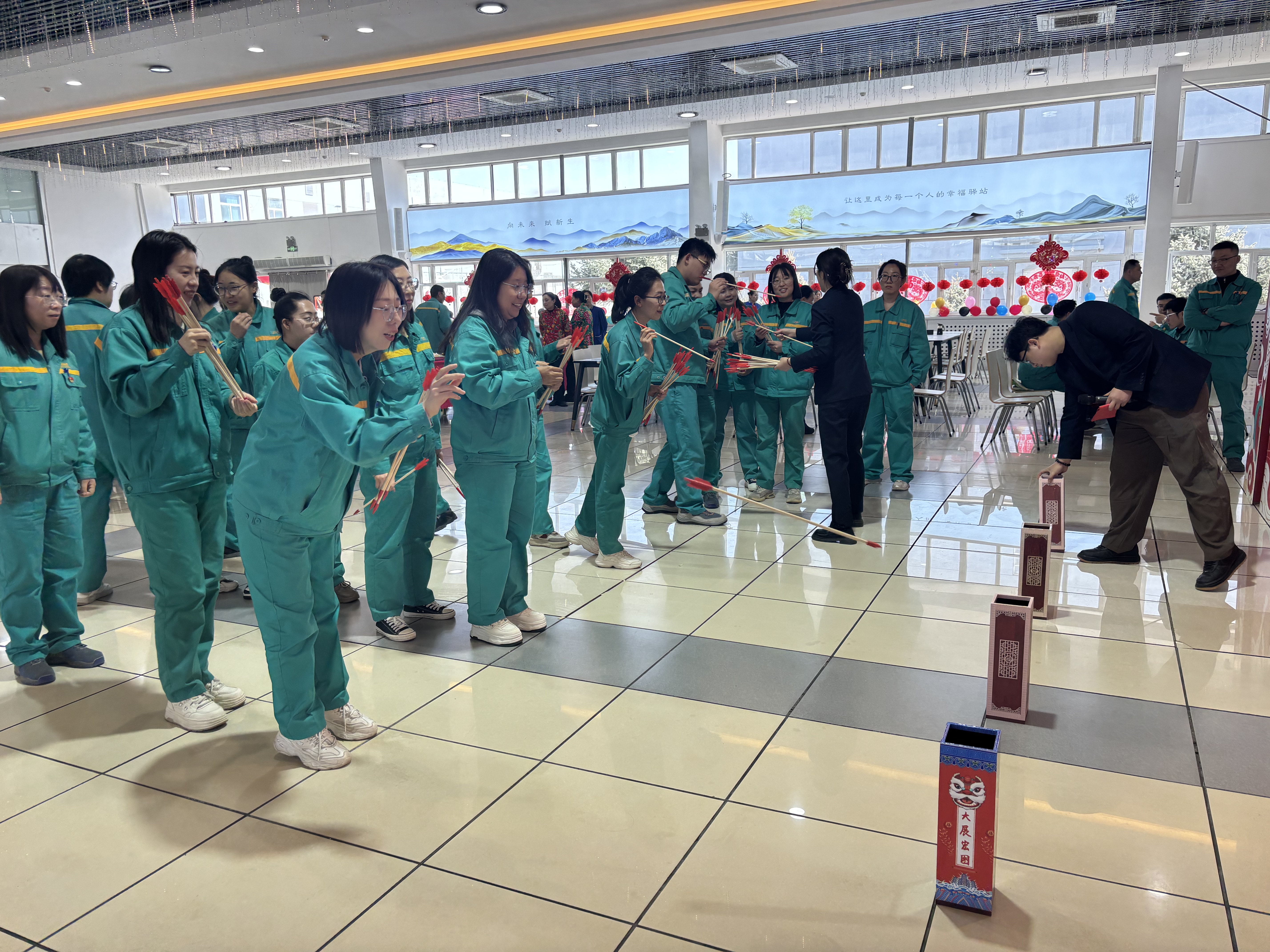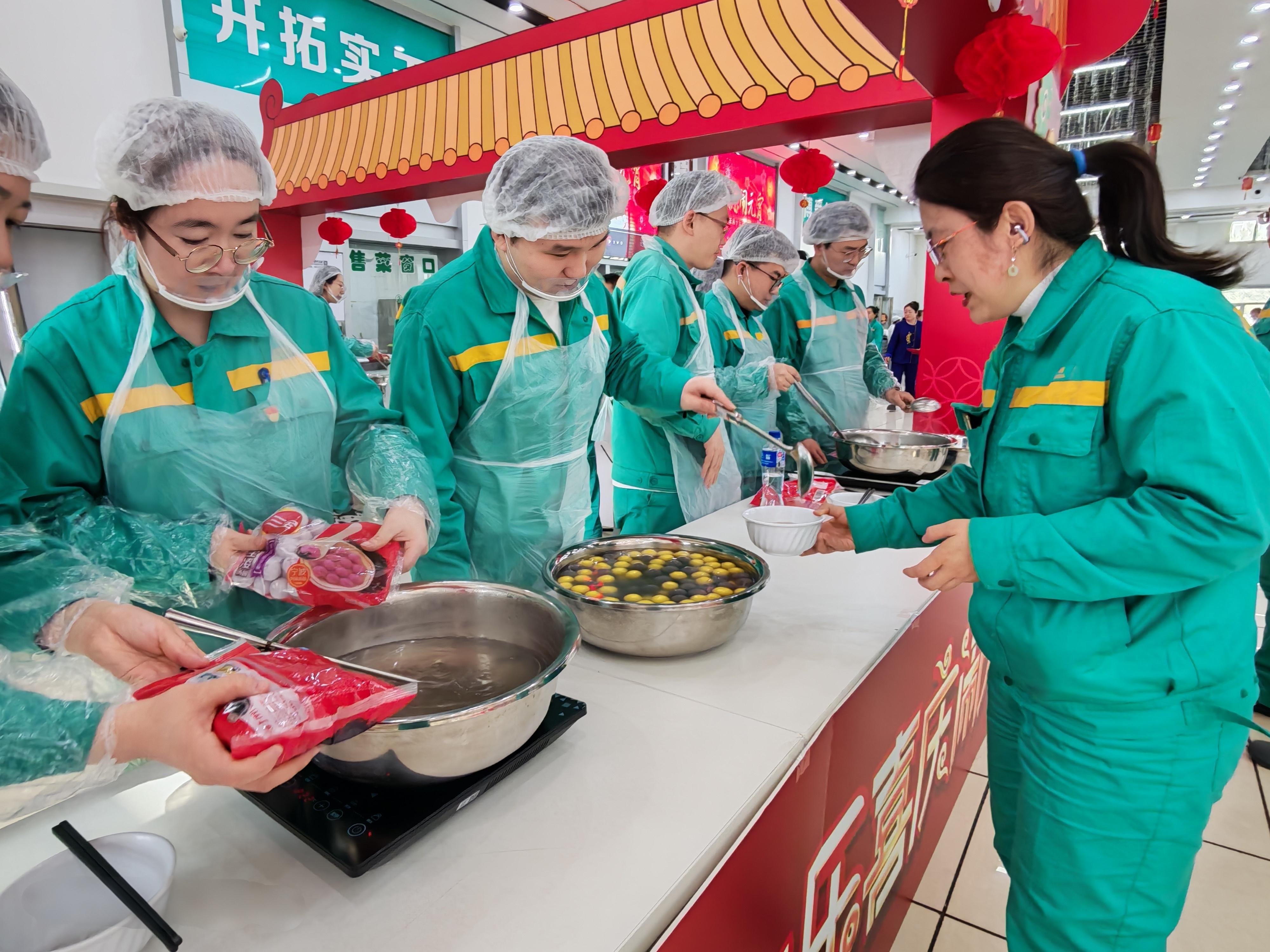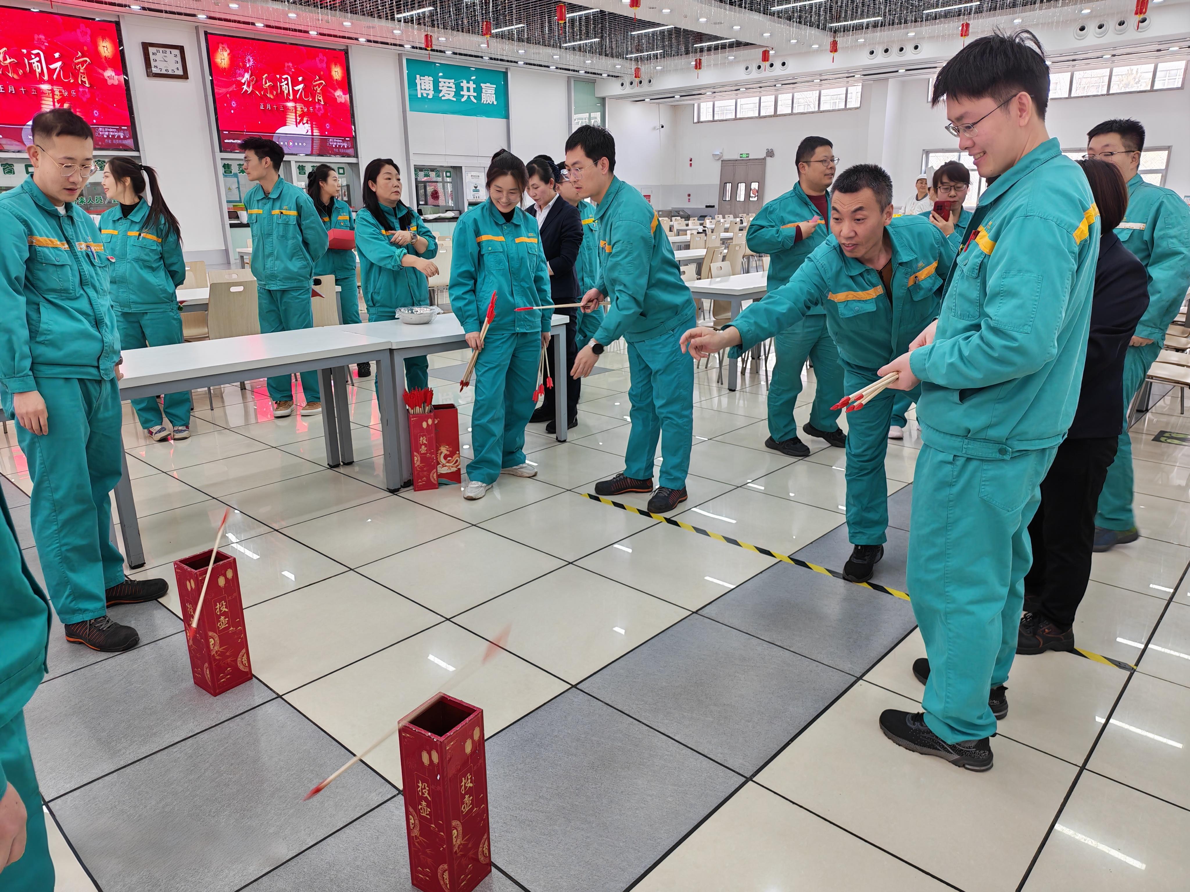 在青霉素事业部会场,同样热闹非凡,暖意满满。灯谜区,大家围在一起你一言我一语,时而低头思索、时而恍然大悟,在猜谜闯关的乐趣中感受传统民俗的魅力。趣味游戏区更是人气爆棚,弹球夺宝紧张激烈,参赛选手屏息凝神、出手利落,精准将乒乓球弹入纸杯。投壶游戏则饱含传统韵味,大家反复比划、轻轻投箭,随着箭矢入壶,现场响起一轮又一轮的欢呼声。第八、九、十、十一党支部的志愿者们早早来到活动现场,提前搭建好服务摊位,现场为同事们煮元宵,送祝福,将一碗碗软糯香甜,热气腾腾的元宵递到大家手中,配上马年专属的暖心话语,暖身又暖心。